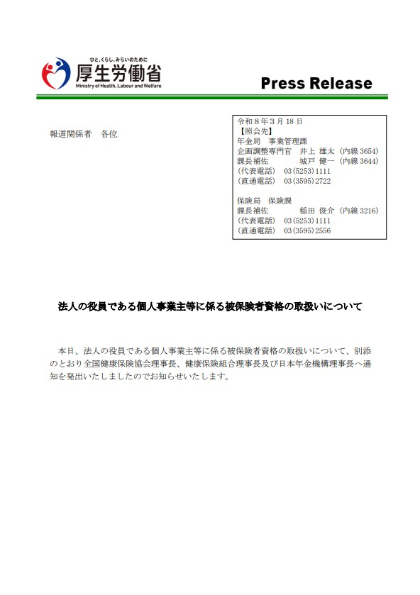 3月18日、厚生労働省は、「法人の役員である個人事業主等に係る被保険者資格の取扱いについて」(令和8年3月18日保保発0318第1号年管管発0318第1号)を発出し、いわゆる国保逃れ対策として法人の役員である個人事業主等に係る被保険者資格の取扱いについて明確化しました。